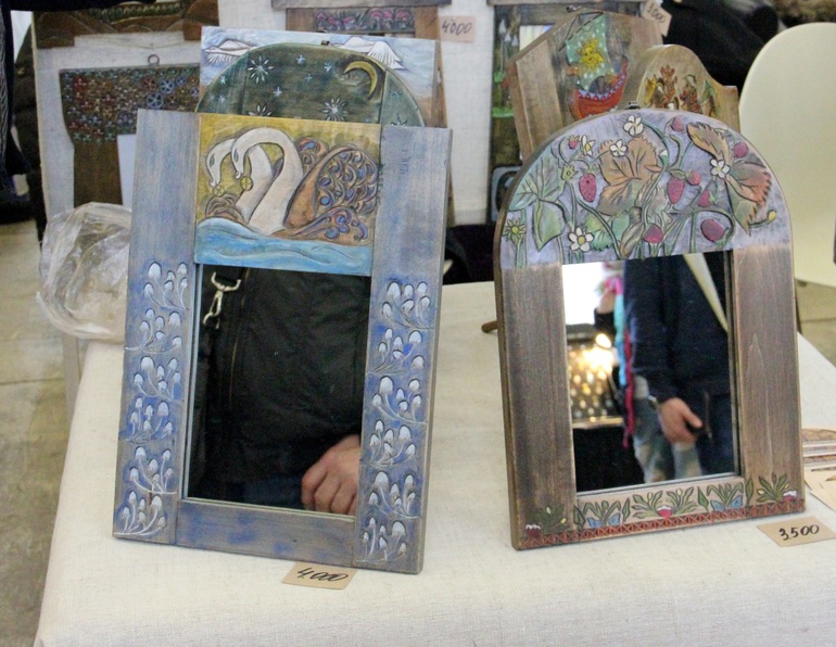 Вот немного зеркал, они украшены резьбой и росписью, добротные, приятные вещи.