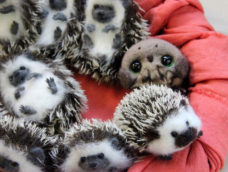 У этой мастерицы интересные реалистичные ежики и другие звери в смешанной технике - валяние и шитье. Маленькие животные-игрушки, броши, здоровские такие)))
