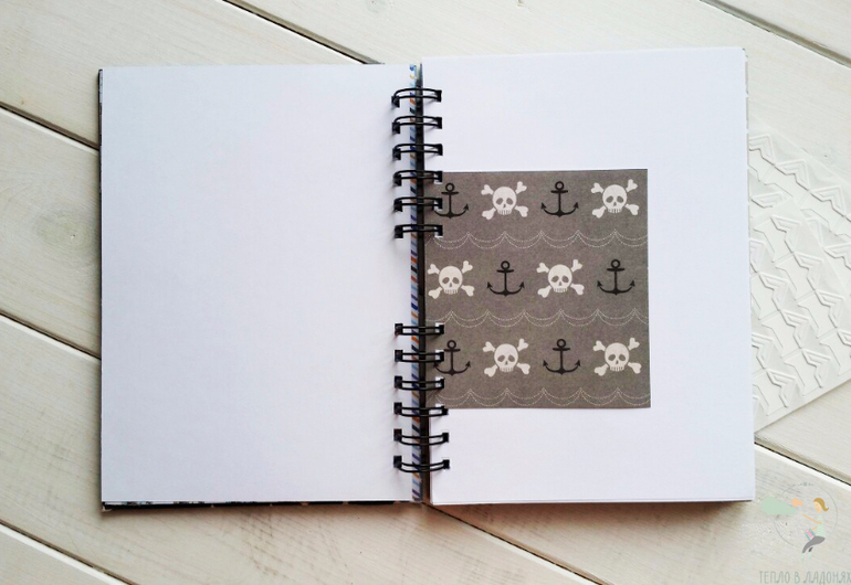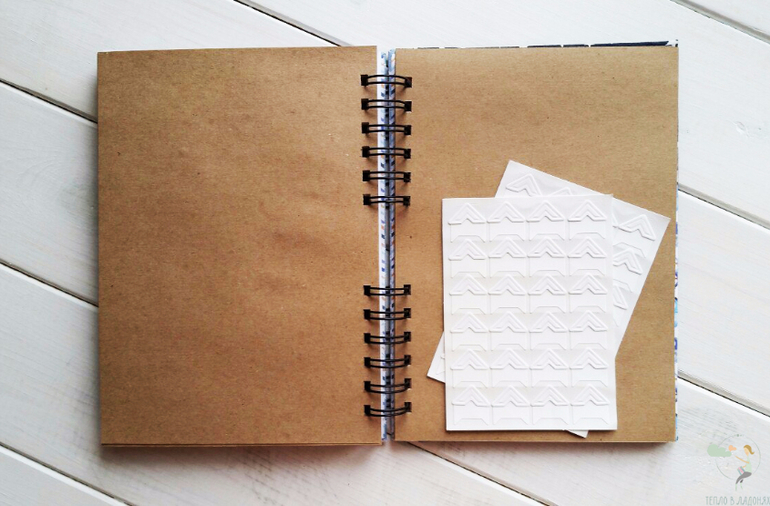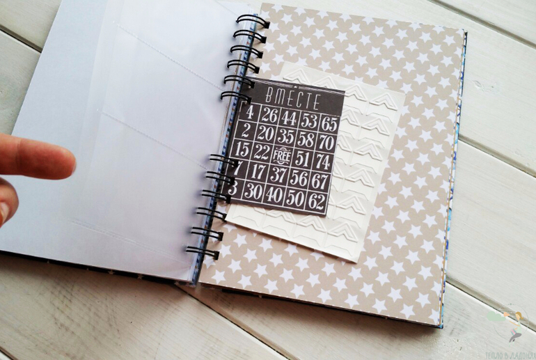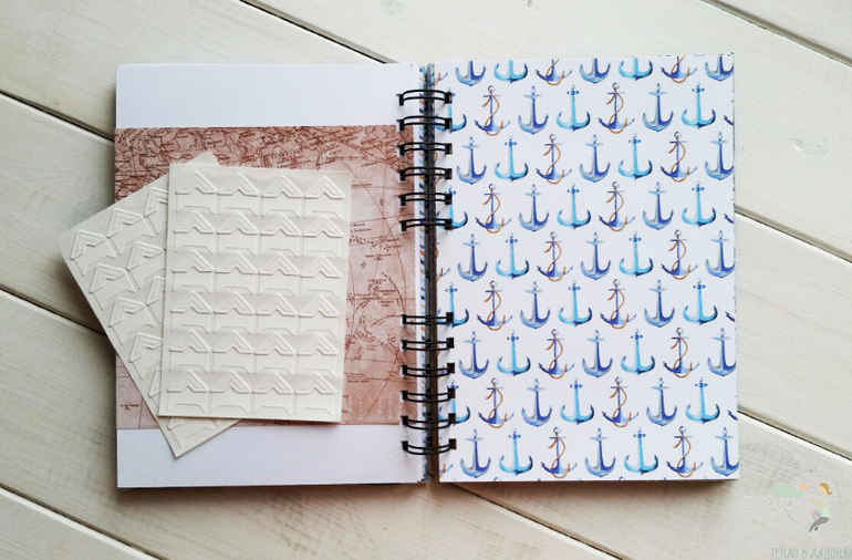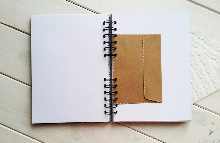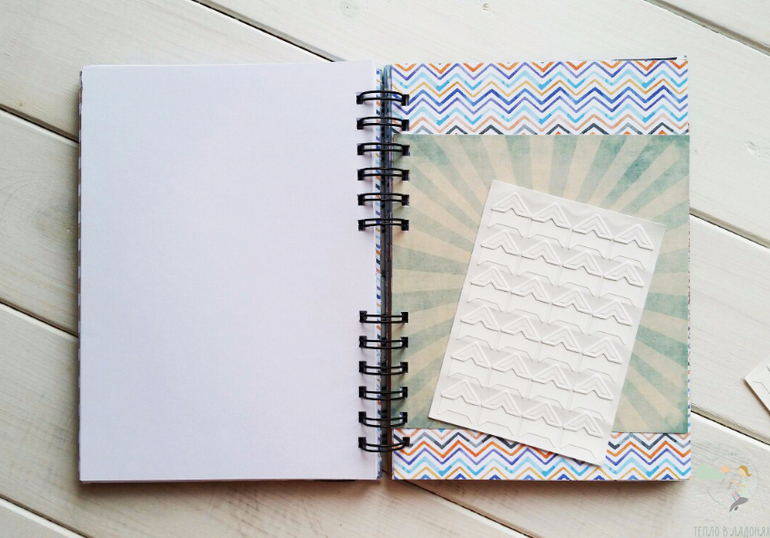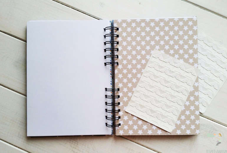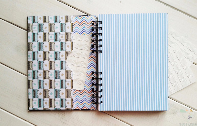 Внутри листочки из белой и крафт бумаги для записей, которые чередуются с вставками из скрапбумаги разных размеров для вклеивания фотографий, карт, билетиков и т.д.