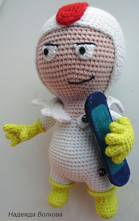 Амигуруми (вязаные игрушки)Девочки, связала повтор Кика Бутовски, на этот раз решила ему скейт смастерить. Пряжа Котон Голд, крючок 2. Ручки и пальцы гнуться. Скейт мастерила из деревянной линейки)
