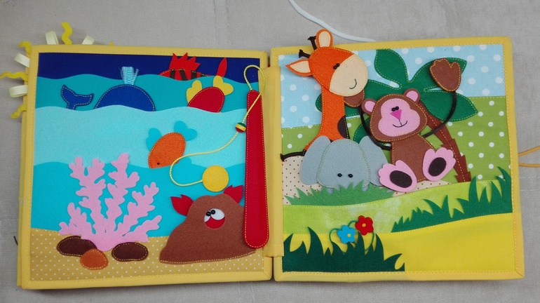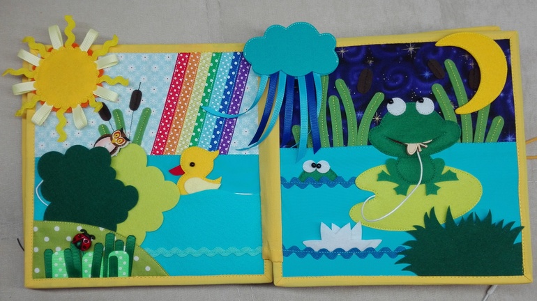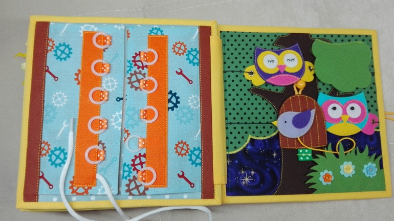 Юля, здравствуйте) Каждая страничка продублирована брезентом, при сшивании двух страничек вместе получается, что лист-это двойной слой брезента. Брезент покрываю белой бязью, затем фон из цветного хлопка или из фетра. Хлопок проклеиваю по периметру полосками флизелина, чтобы при пристрачивании фон не вытягивался и не перекашивался под лапкой. Полоски из флизелина нарезаю по долевой. Синтепон и дублерин я не использую.