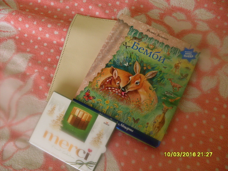 Мне Настена прислала набор кожи для творчества.Шоколад вкусненький! И Диме книгу.Не просто книгу-КНИГУ! Она невероятная! Если у кого то есть книги этой серии,они меня поймут!