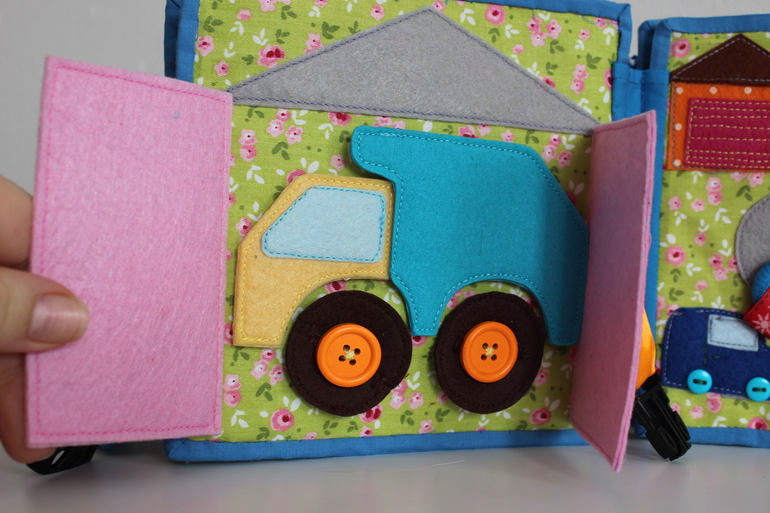 Третий переплет «транспорт». На первой страничке гараж за замочком, открываем замок, дверки - а внутри камаз. Его можно собрать как пазл - он на липучках, а колеса на пуговицах. На второй странице шнуровка - дойди по дороге к гаражу.