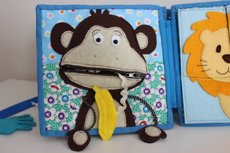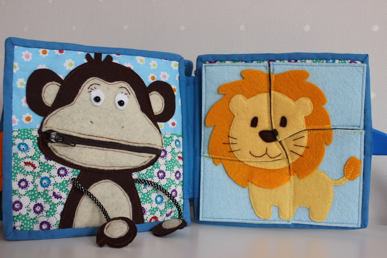 Четвертый разворот «животные африки». Тут у нас пазл «львенок» из 4 частей, а обезьянка - ротик которой расстегивается на молнии и можно достать бананчик на ленточке.