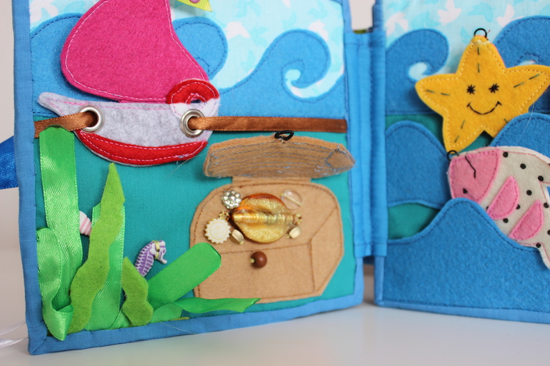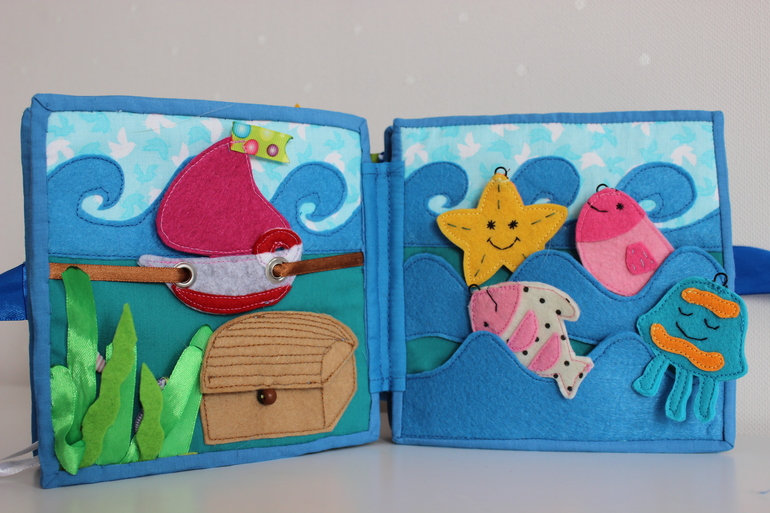 Второй переплет «Море» тут у нас кораблик который можно передвигать по ленточке, за водорослями спрятались морские обитатели, а в сундуке сокровища. На второй страничке рыбалка, удочкой с магнитом мы ловим рыбок.