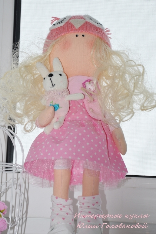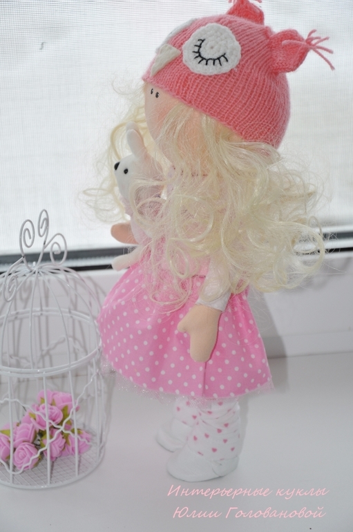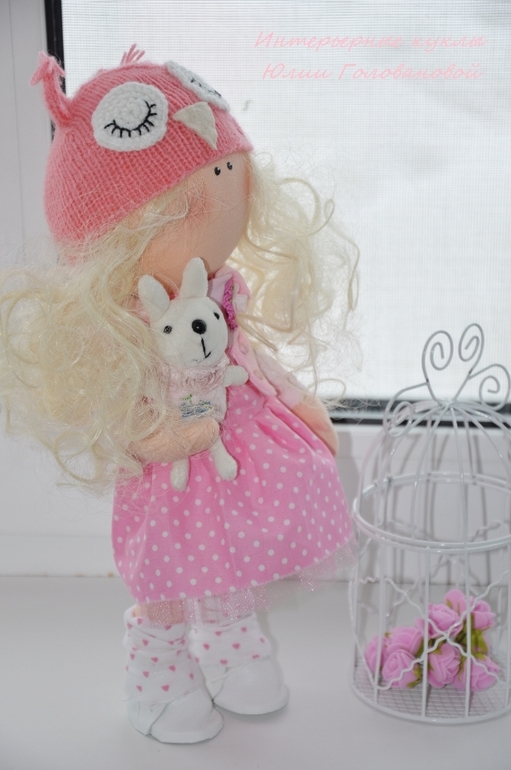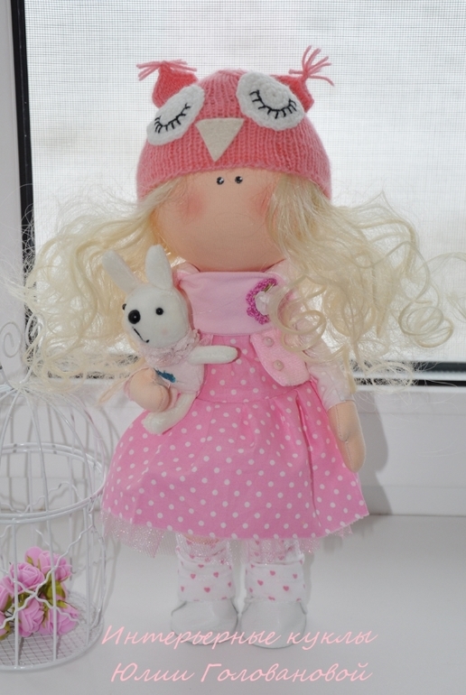 Кукольный мир - человекоподобные куклыЛюбимая совинья шапочка, любимый горошек, нежный розовый цвет, зайка в ручке......Всё это моя новая девочка. Рост куколки 36 см.