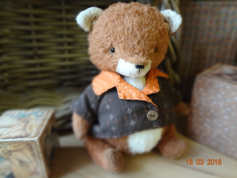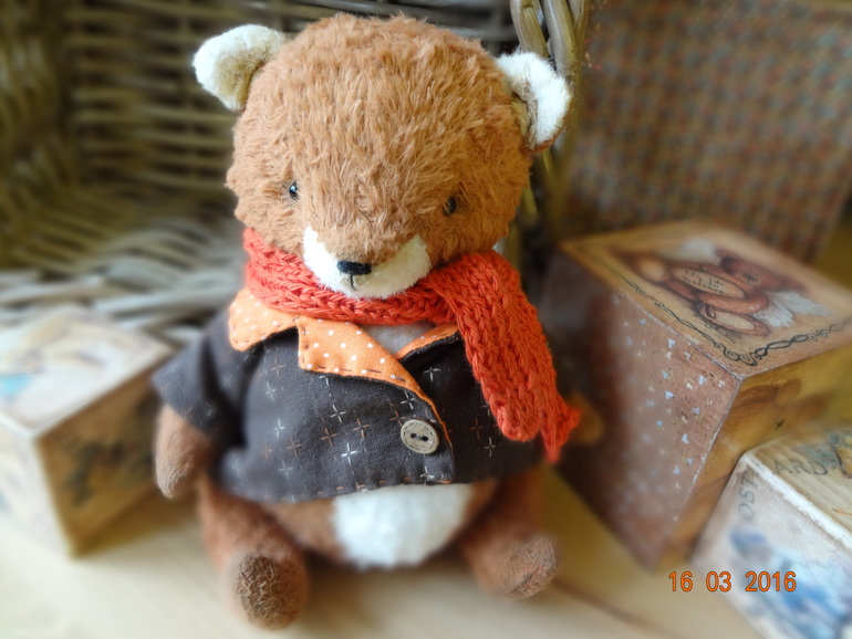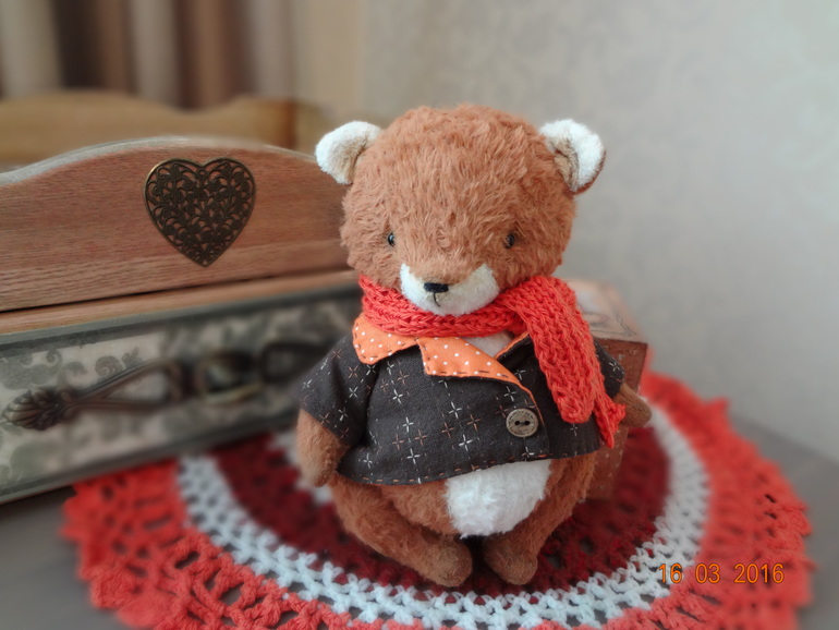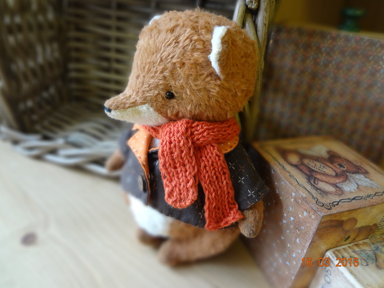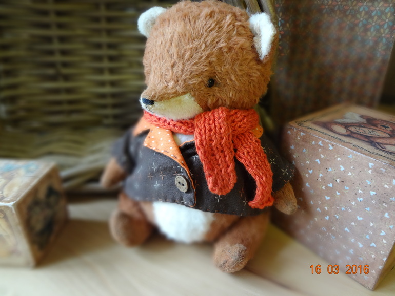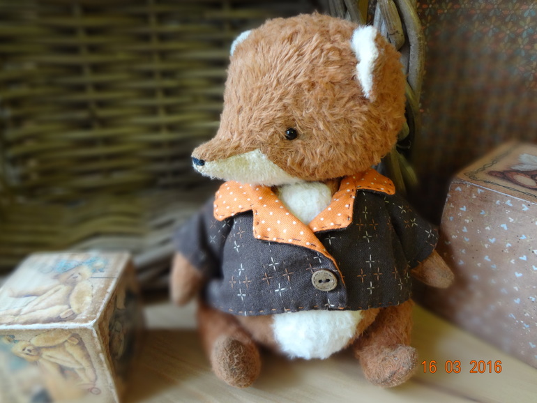 Тедди: мишки и их друзья.Лисенок тедди сшит из немецкой вискозы,набит плотненько древесными опилочками,утяжелен стальным гранулятом. Такой он получился пухляш,приятно держать в руках. Шплинтовое крепление,голова плавно покачивается. Лисенок сидит уверенно,стоит с поддержкой.Одет в пальтишко из японского хлопка,на шее вязанный шарфик. Лисенок сшит полностью вручную,в единственном экземпляре с большой любовью и теплом.. Авторская выкройка.