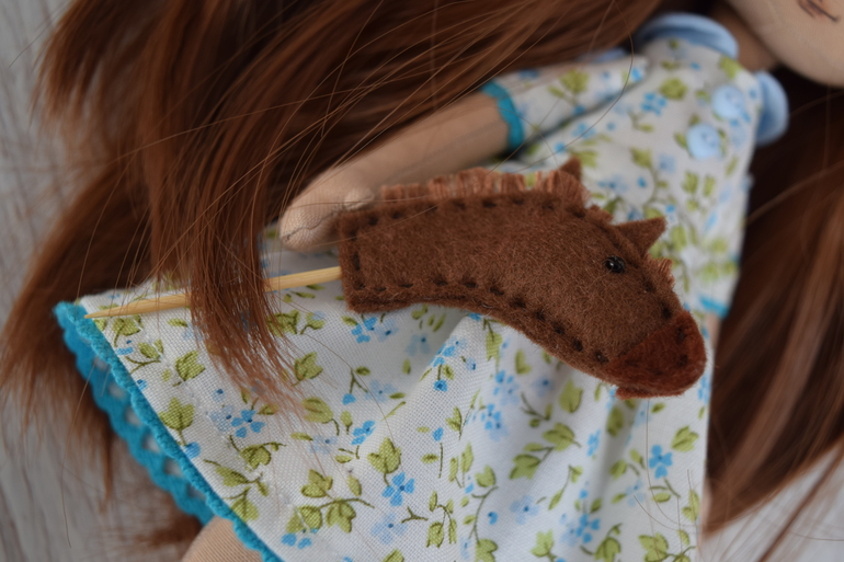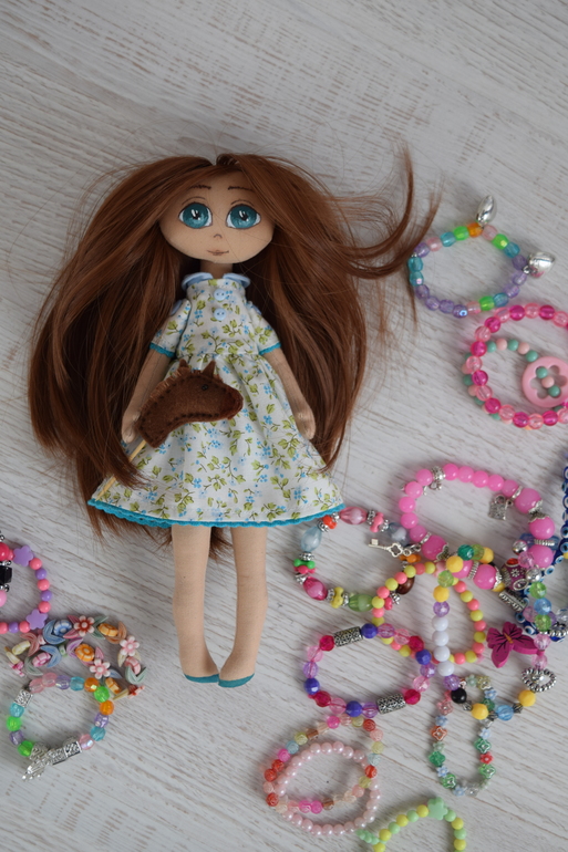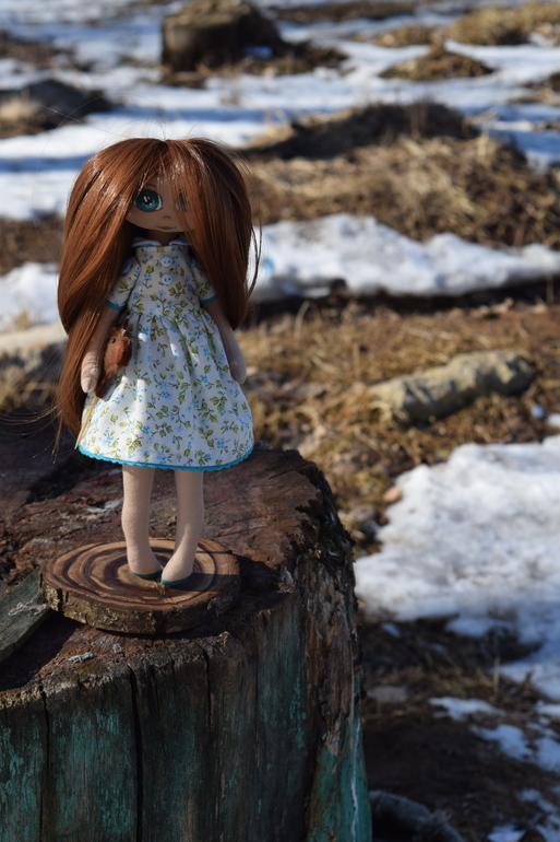 Первая моя куколка с нарисованной мордашкой. Повышенной лохматости девочка, волос копна больше, чем у меня)))) Рост около 25см, стоит с подставкой, не сидит.