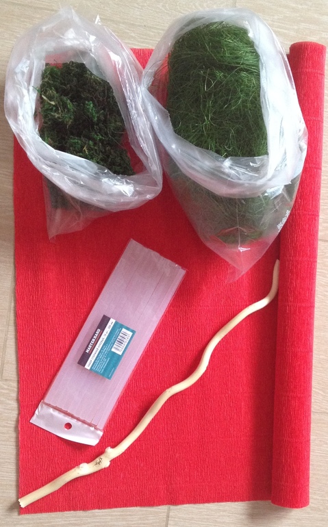 Слоник - материалы для топиария: сизаль зеленого цвета, корелис белый, мох консервированный, гофрированная бумага красного цвета (100*50 см) и стержни для клеевого пистолета.![]()