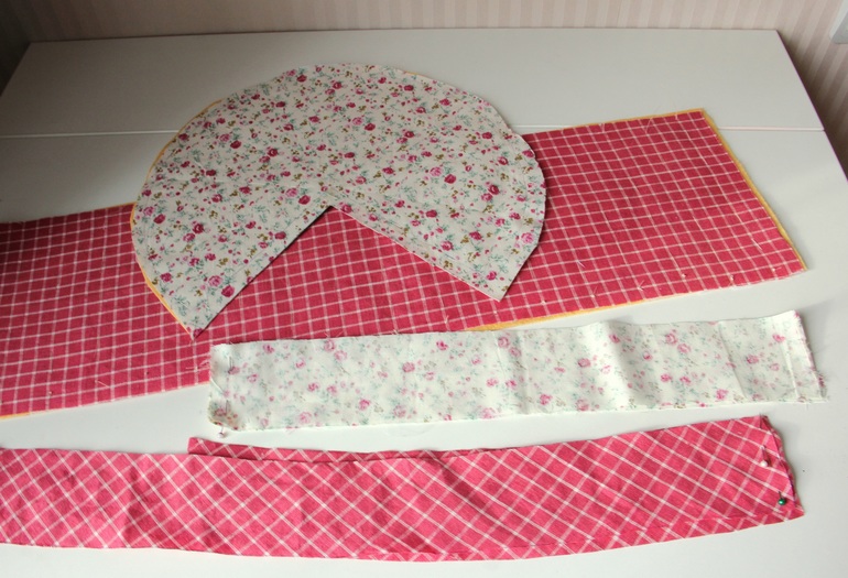Решила взять горошковую ткань коричневую на подклад, ее и не видно (она меня раздражала своим плохим качеством. А вот цветочковый сатин пустила на крышу и отделку.