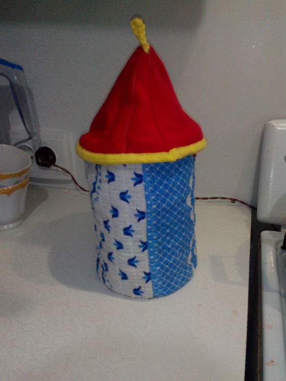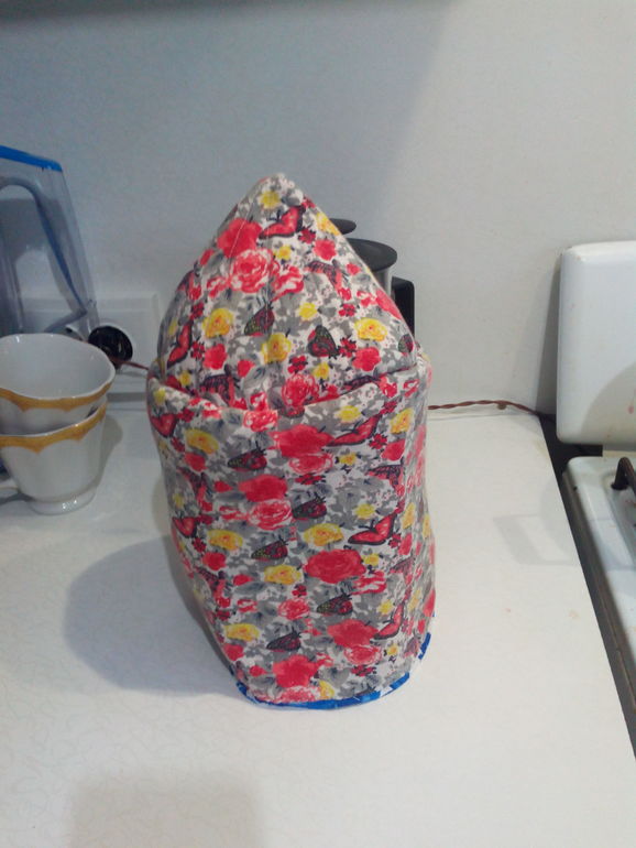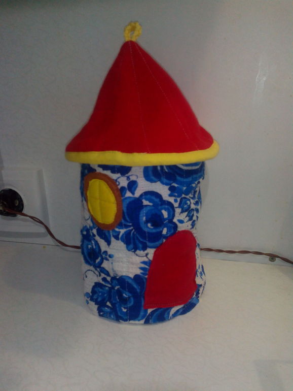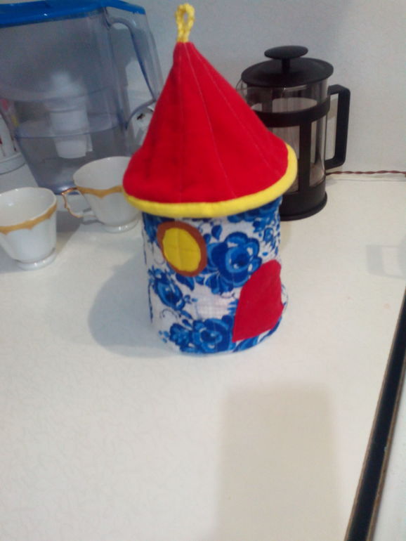 Мой домик на чайник. Получился не идеально, но не плохо. Ткань вафельное полотно гжель, подкладка салфетка, изнанка-трикотаж бабочки. Спасибо за МК.