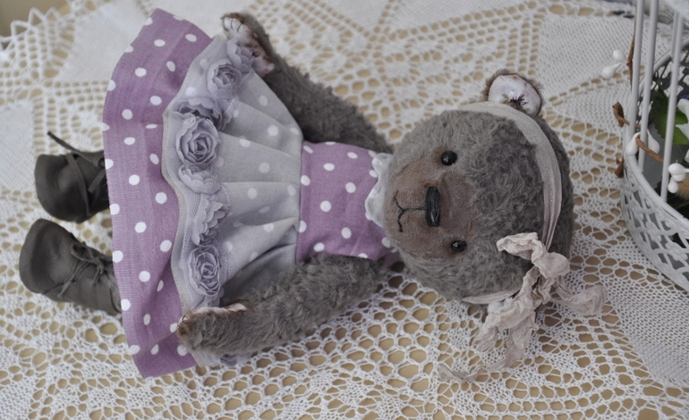 Тедди: мишки и их друзья.Мишка сшита вручную из немецкой вискозы. Вискоза красивого серого оттенка с розоватым отливом. Набита плотно опилками утяжелена гранулятом. Приятно тяжелая. Руки, ноги, голова на шплинтовых креплениях, голова покачивается.