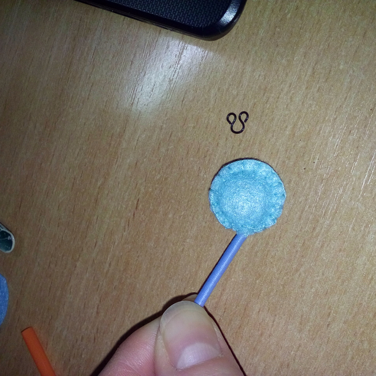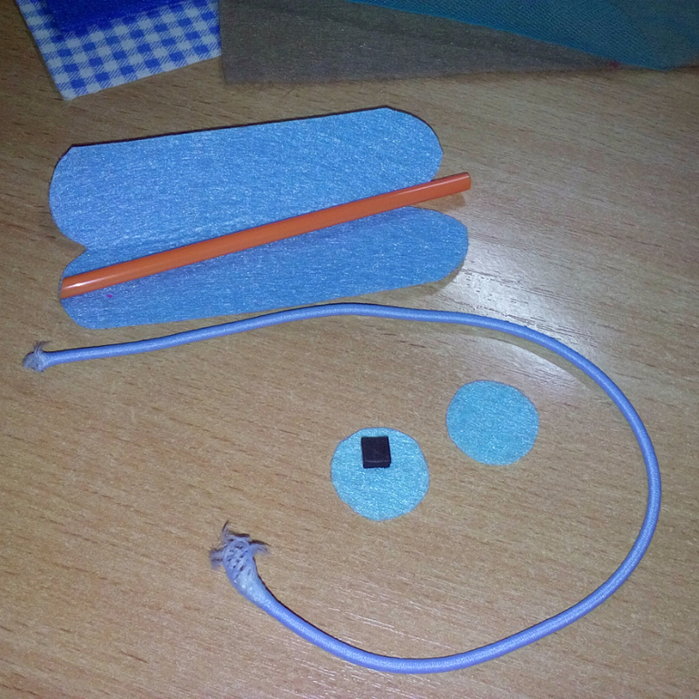 10. Вырезала детали для удочки: рукоятку, два кружочка, резинку опалила с двух сторон, нашла трубочку нужной длины и магнитик.