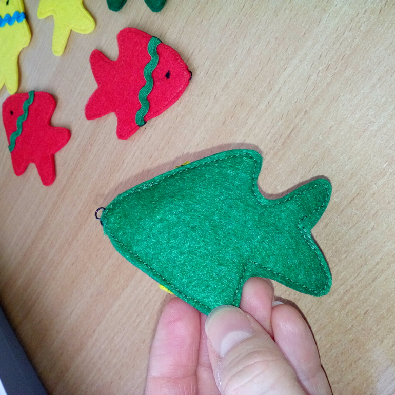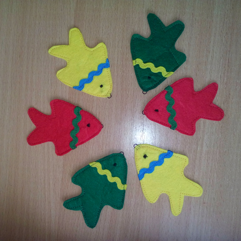 Попробовала собрать их на удочку, неудача. Слабый магнит. Нашла посильнее, заново переделала кончик, и теперь уже прострочила кружки на машинке, так аккуратнее. Всё, теперь поймала всех рыбок.