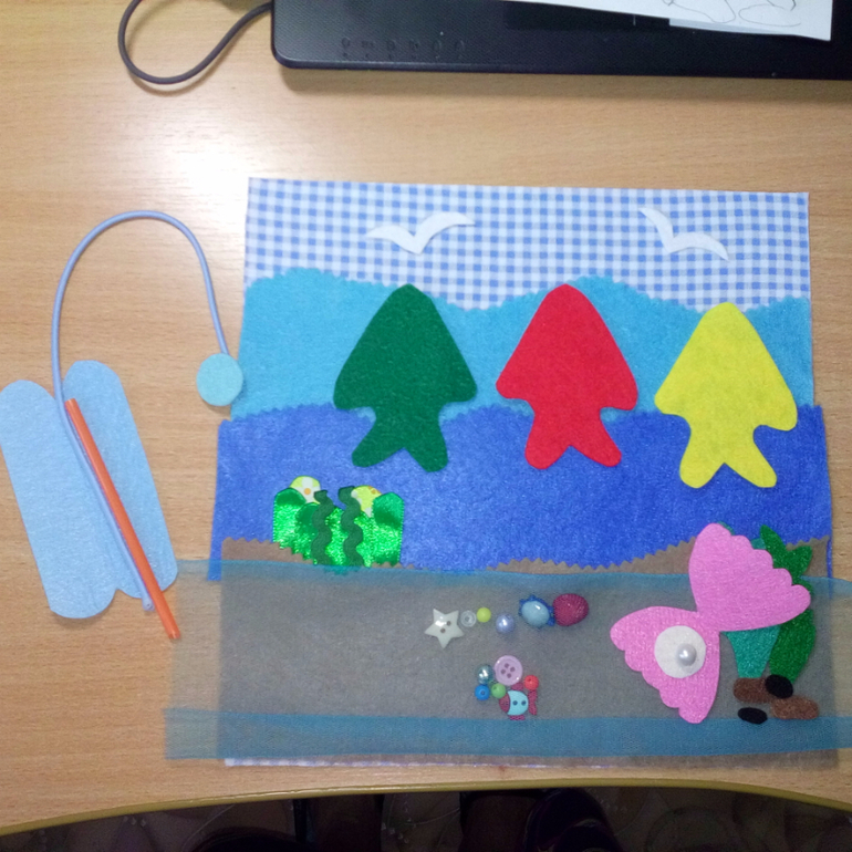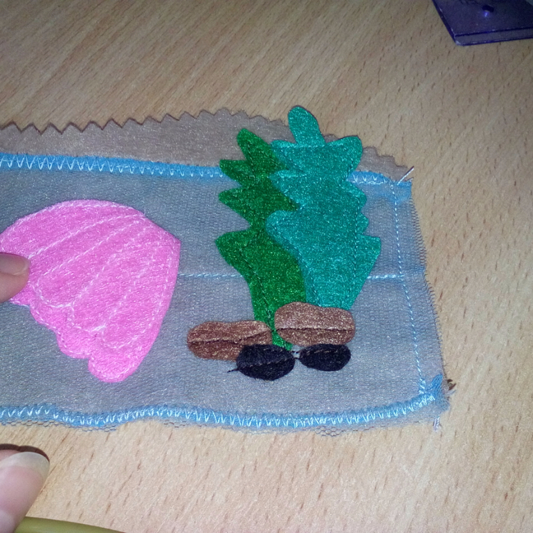 22. Пришила три пуговки к готовой страничке: черепашку, рыбку и ракушку.