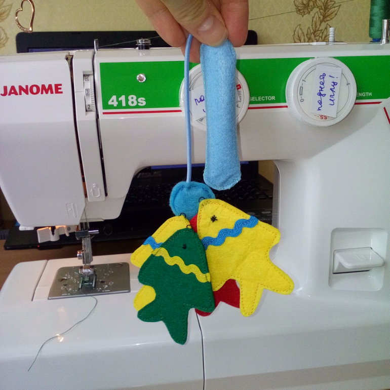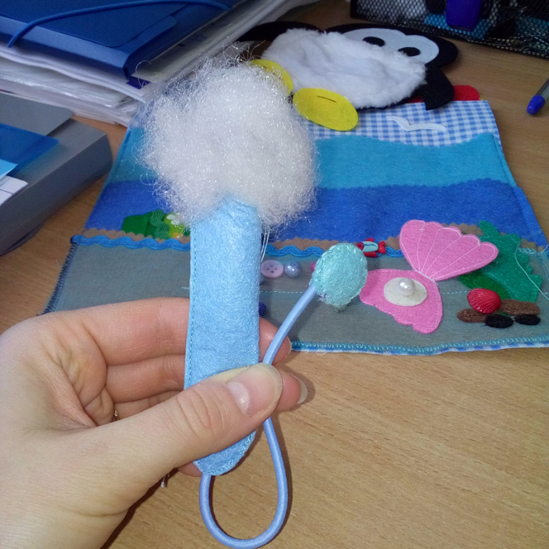 24. Прострочила рукоятку не до конца, вставила резинку в трубочку для жесткости, и всё вместе вставила в фетровую деталь, набила холофайбером и застрочила.![]()