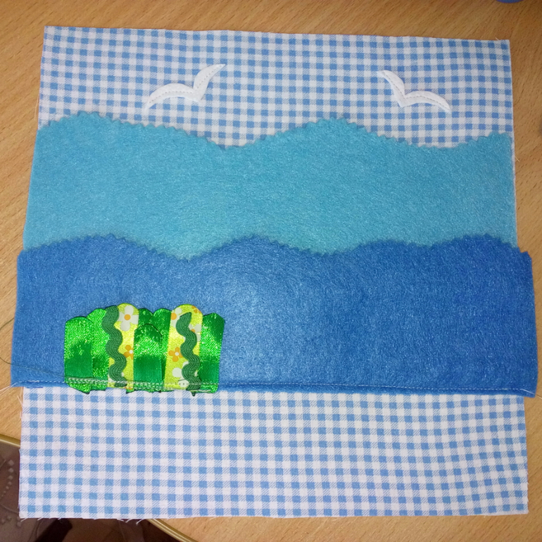 15. Ко второй волне пристрочила травку и пришила всё к основе по нижнему краю.