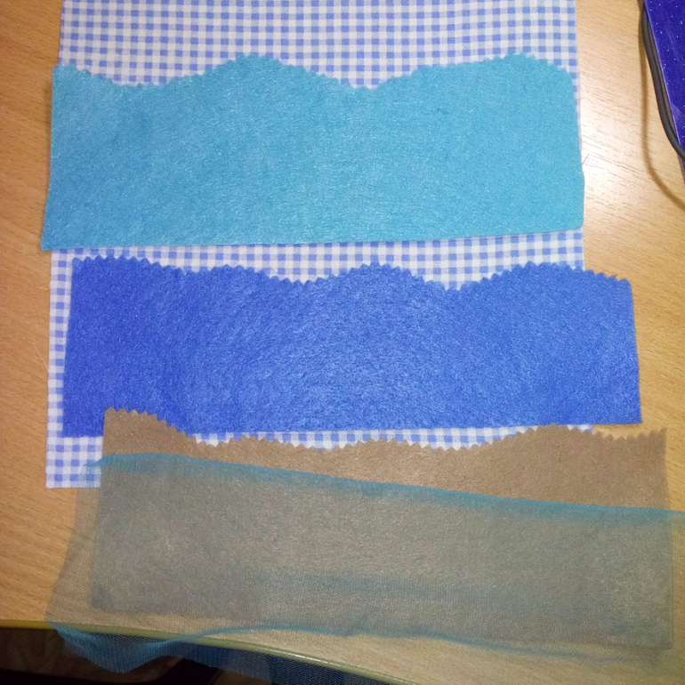 21. Пришила нижнюю песочную волну к основе. Пристрочила синюю тесьму-змейку. Пришила жемчужинку.