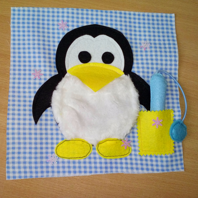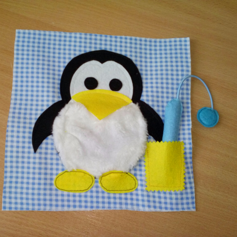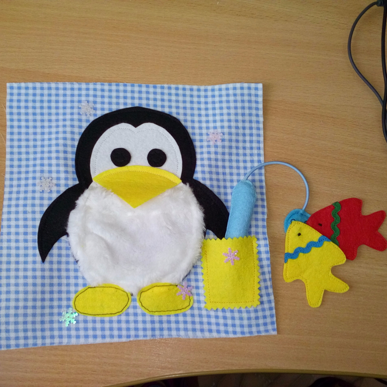 Страничка называется «Пингвинчик на рыбалке», её основная развивающая и обучающая составляющие таковы: мелкая моторика (магнитом удочки подцепляем рыбок, потом их укладываем в кармашек на животике пингвинчика или в ведерко, учимся вставлять удочку в ведерко), лабиринт с бусинками, которые нужно перегнать пальчиком из одной половины в другую), сенсорика (фактуры и цвета), познавательный аспект (рассказ о пингвинах, где живут, чем питаются, понятия разный - одинаковый (рыбки), больше - меньше).
