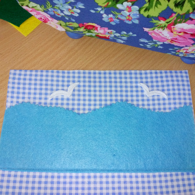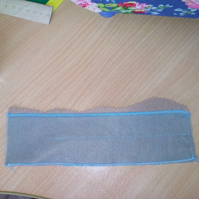 16. К выкройке берега пристрочила сеточку с трех сторон, прошлась зигзагом по верху и низу. Сделала строчку посередине, не доходя до края.