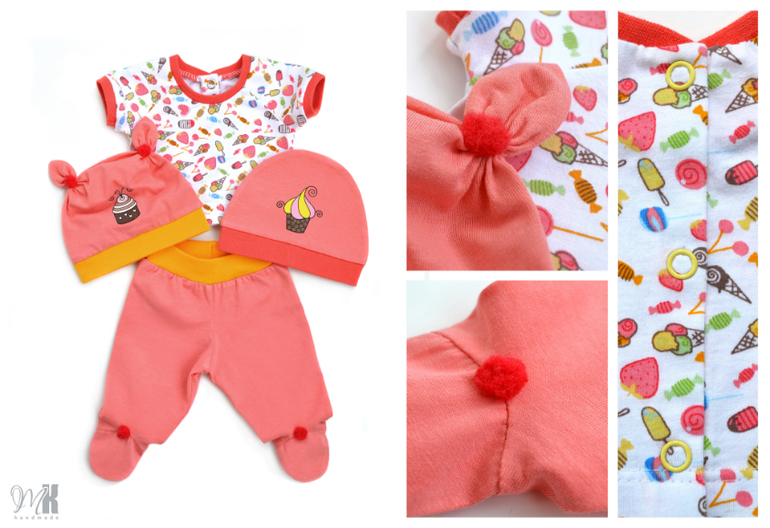 Комплект в коралловых тонах: ползунки, кофточка и две шапочки. Все из кулирки х/б, а на отделке - рибана с/л.