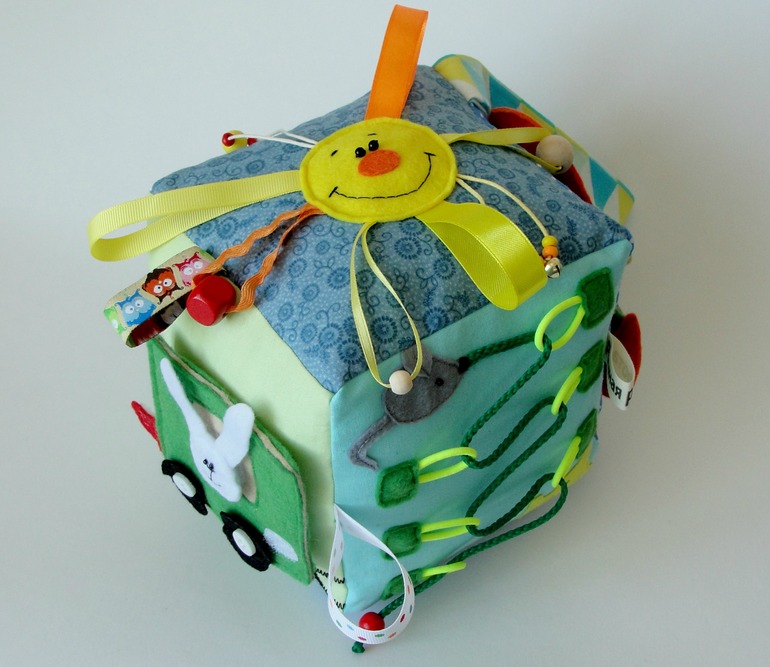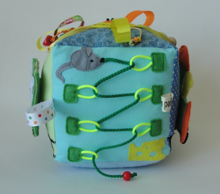 К кубику пришита удобная ручка, за которую можно носить кубик, подвесить его в кроватку или коляску.