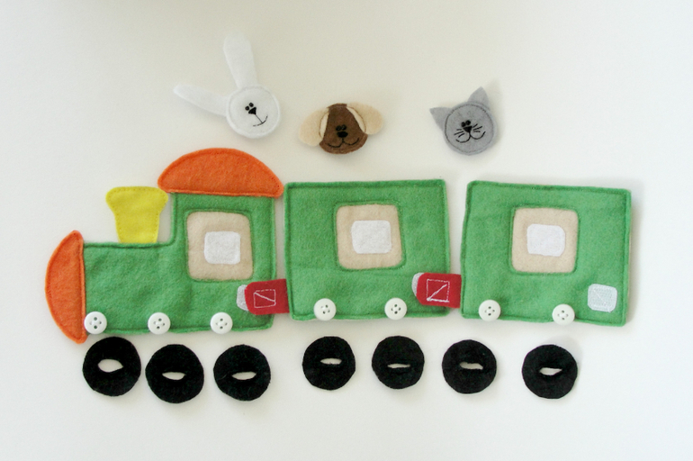 Паровозик и вагончики сделаны из трех слоев фетра, поэтому они достаточно плотные и приятные для игры. В каждом окошке сидят веселые зверята - котик, зайчик и собачка. Их можно откреплять от окошка и менять местами, делая кого то машинистом, а кого то пассажиром. Все колеса можно снимать и одевать, пристегивая на пуговицу. Таким образом ребёнок может научиться расстегивать и застегивать пуговицы и развивать мелкую моторику.