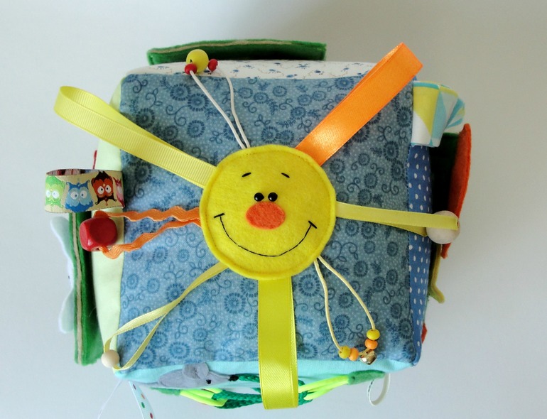 Пятая сторона - солнышко. Солнышко сделано из яркого желтого фетра, а лучики из разных по толщине, размеру и фактуре ленточек и бусин, что развивает тактильные ощущения у ребёнка. Если нажать на солнышко оно шуршит, а к одному из лучику сделан бубенчик, который звенит.