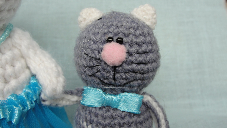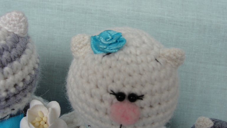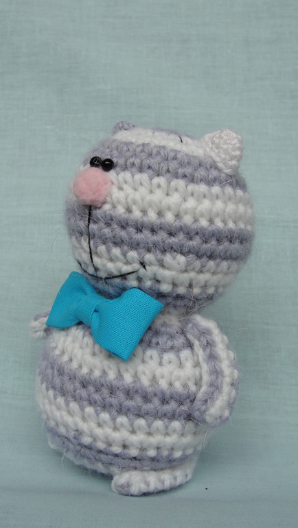 И наконец маленький серенький котеночек с белыми ушками. Он любит подражать папе - коту и поэтому на шее у него тоже есть маленький голубой бантик.))