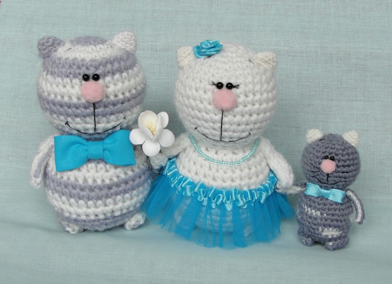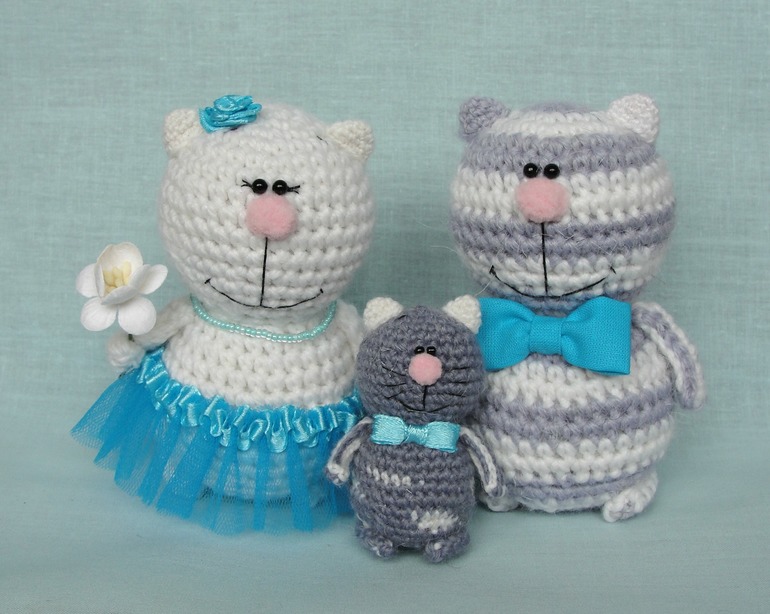 Амигуруми (вязаные игрушки)Эта семейная пара кошек с маленьким котенком связана с большой любовью и нежностью.