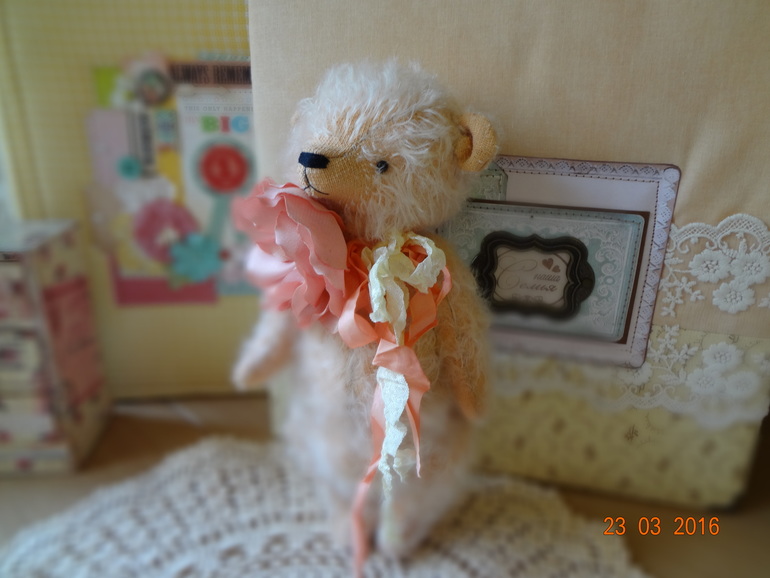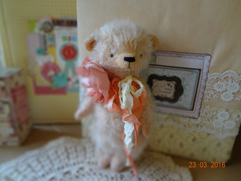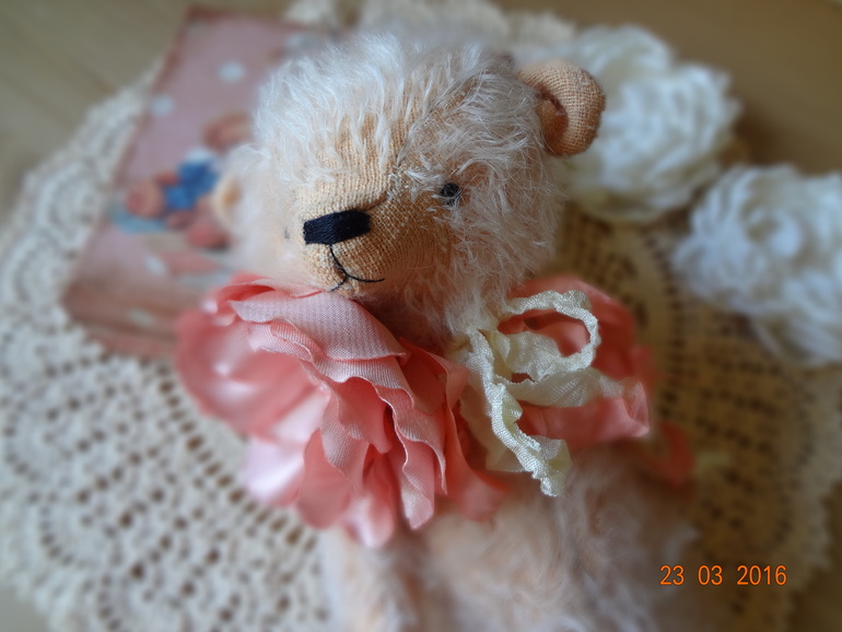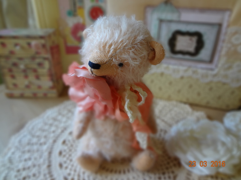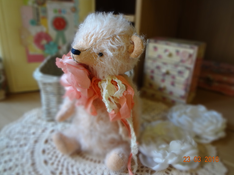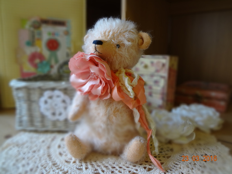 Тедди: мишки и их друзья.Мишка тедди Поли сшита из пушистого мохера,получилась такой воздушной и нежной. Рост 22см. Внутри отборные опилочки,в животике металлический гранулят. Глазки стеклянные. На шее бант ручной работы. Мишка сшита полностью вручную с большой любовью и теплом в единственном экземпляре. Авторская выкройка.