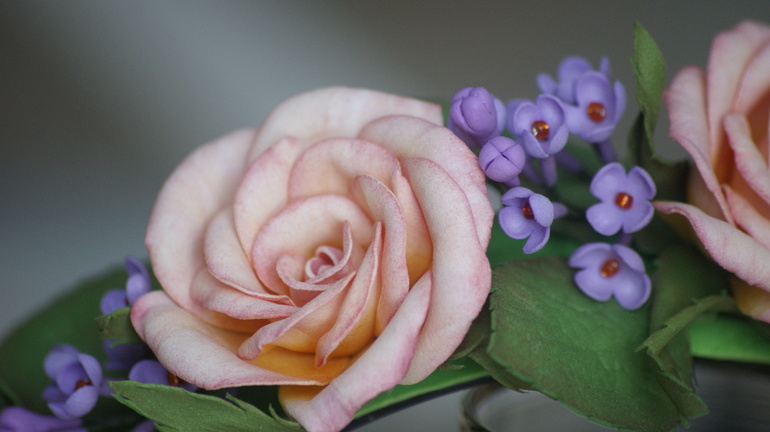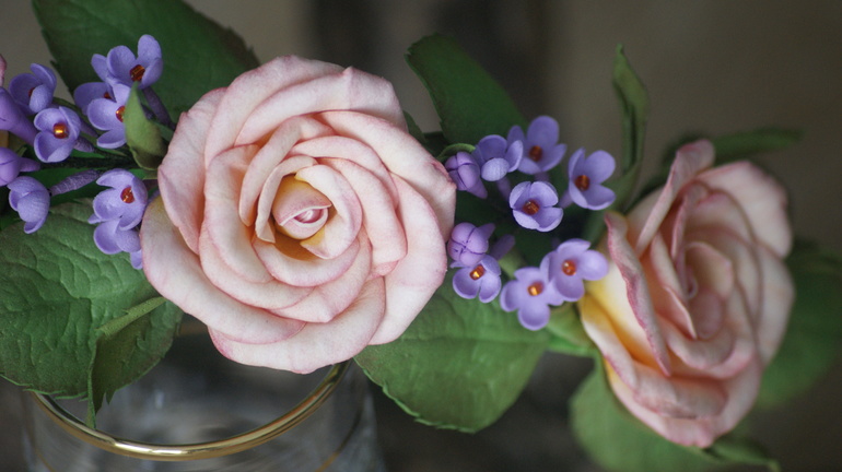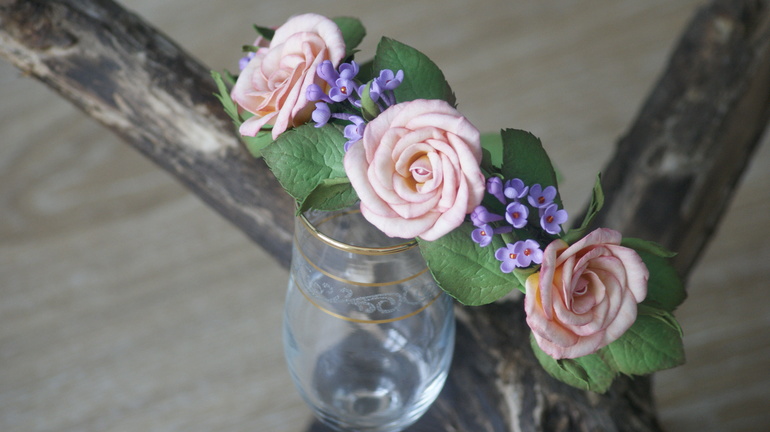 Цветы из ткани и форма. Канзаши. Украшения для волос.Всем приветик! Сотворился у меня один ободок для одной девчушки. Все цветочки сделаны из фоамирана, кроме бутонов сирени - они сделаны из запекаемой полимерной глины.