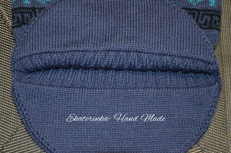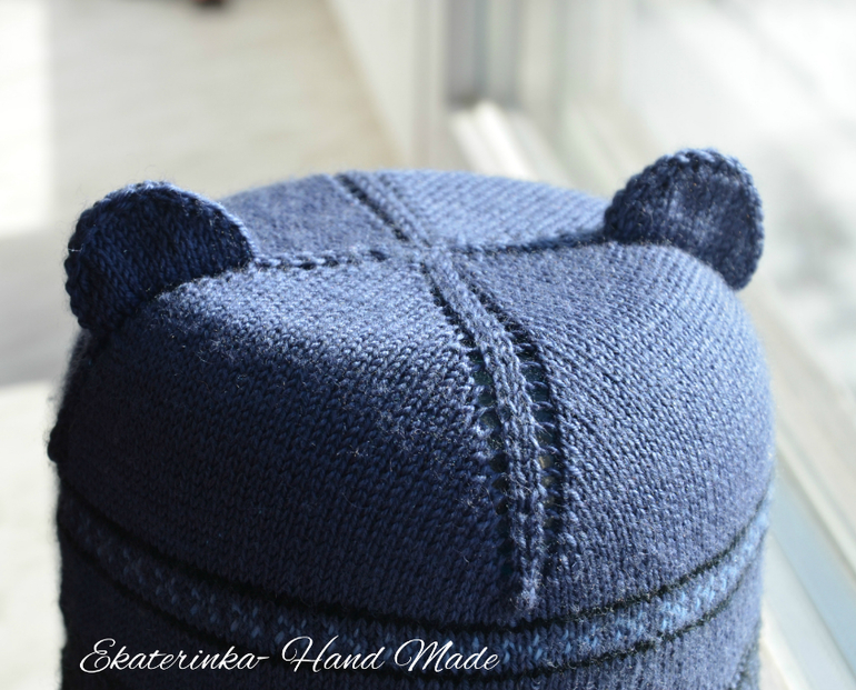 , дался он тяжеловато. Несколько раз перевязывала макушку из-за того, что там где рисунок, полотно не тянется совсем, получалось узковато. А где просто лицевая гладь - тянется хорошо.Потом совсем забросила шапку. И сейчас решила все таки довязать на весну. Так как там где ушки идет плотное переплетение нитей и продувать не должно