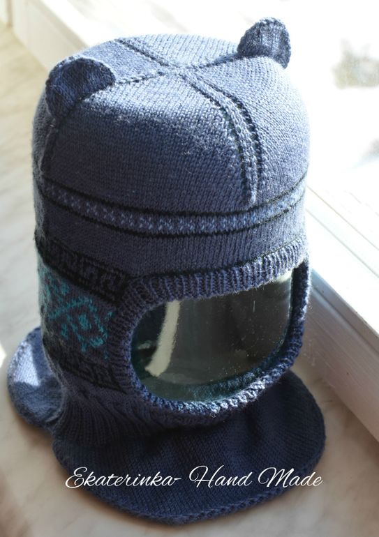 Довязала наконец-то шапку-шлем для сына. Шапка вышла по мотивам двух предыдущих, что носили (носим)