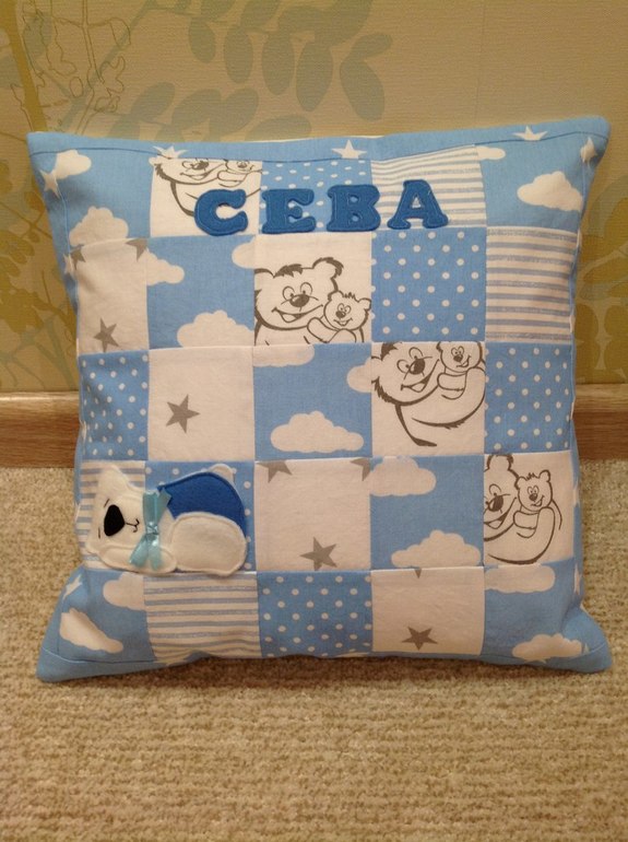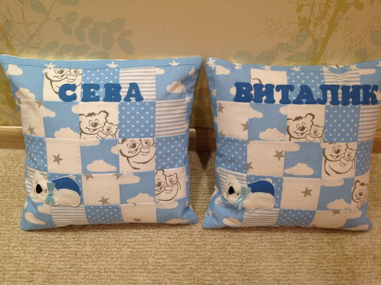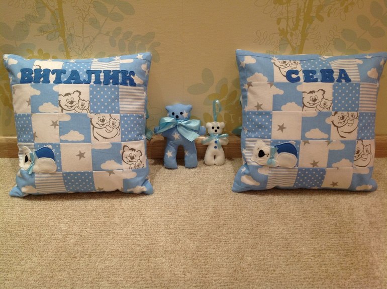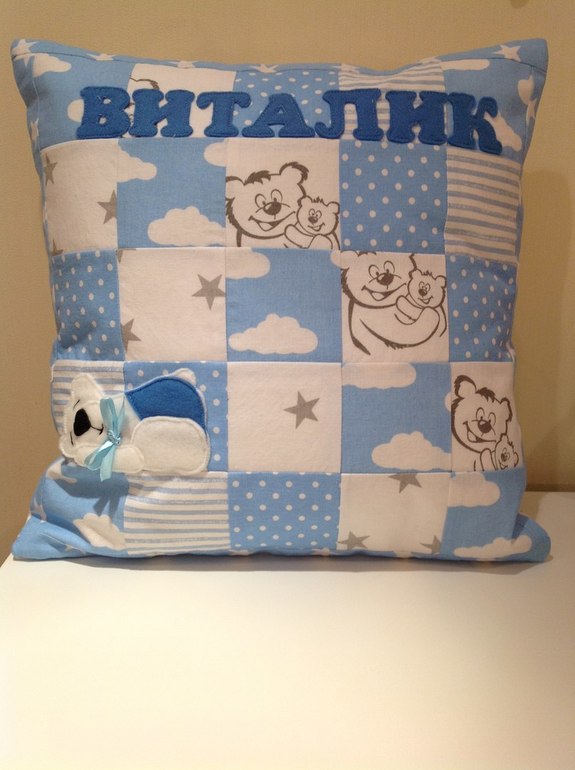 Шитье одежды, выкройки, ремонт одежды, шторы, швейные машины (уже приобретенные)Привет, всем. Сшила для маленьких братиков по подушке именной, мягкую игрушку и маленького белого мишку- погремушку (внутрь положила 2 бубенчика). Под кат более 5 фото)