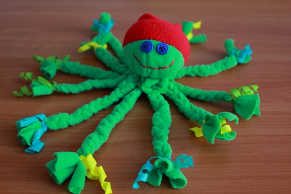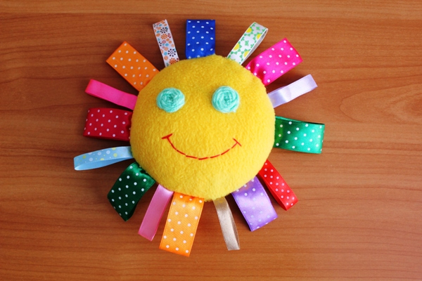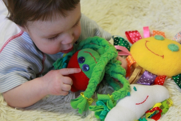 Флис, ленты, пуговки, акриловая пряжа. Наполнитель у всех игрушек холлофайбер. Облачко звенит, солнышко шуршит. Идеи - интернет. Выбор "персонажей" (кроме осьминожка) - дело сына.