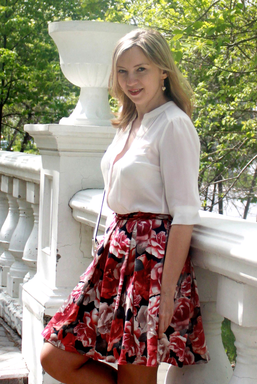 На работе за дресс-код пока нас не гоняют, поэтому в числе любимых юбочек на все сезоны - эта до сих пор, она хоть и цветастая, но сдержанная по цветовой гамме. Эти розочки настолько реалистично смотрятся, цифровая печать, сейчас уже этим не удивишь, а несколько лет назад мне эта ткань показалась необыкновенно красивой.
