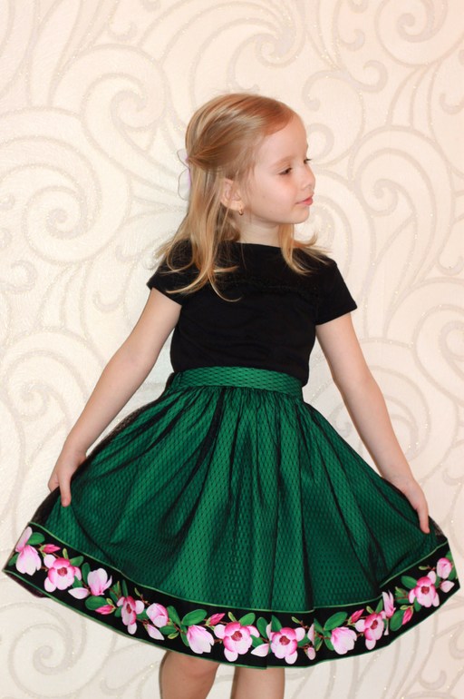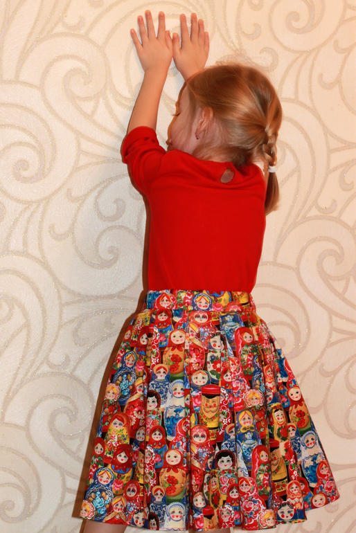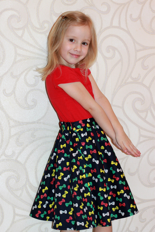 3. "Бантики". Простая юбочка из плотного хлопка, такая же есть у меня, я свою буду носить с желтой блузкой и мятным топом, они еще пока в проекте, потом покажу. Полинкина юбка - полу-солнце со сборкой, сзади пояс на резинке.