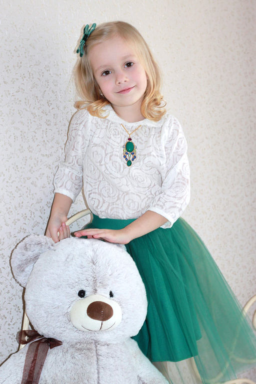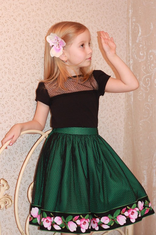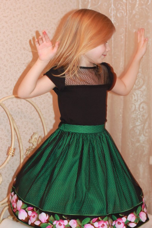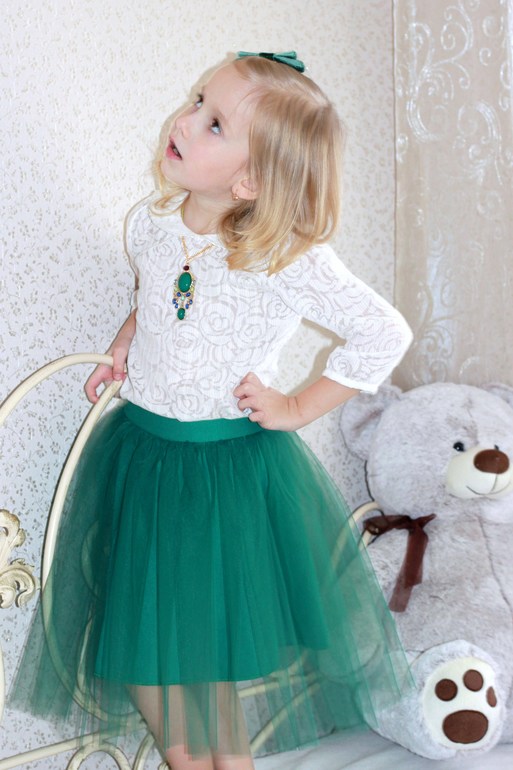 , фото нет, на фотосессии у нас до них и дело не дошло. Полинкина юбка из 2 слоев фатина, каждый шириной 3 м. Себе к юбчонке подобрала светлую блузку, а у Полинки ничего не было "в тему", пришлось перешить блузку из моего сарафана. Кулончик на цепочке сделала из сережки, есть у меня такие вещицы, купленные непонятно зачем, мне понравилось, как он поддержал цвет юбки, ну и образ такой получился немного "ретро".