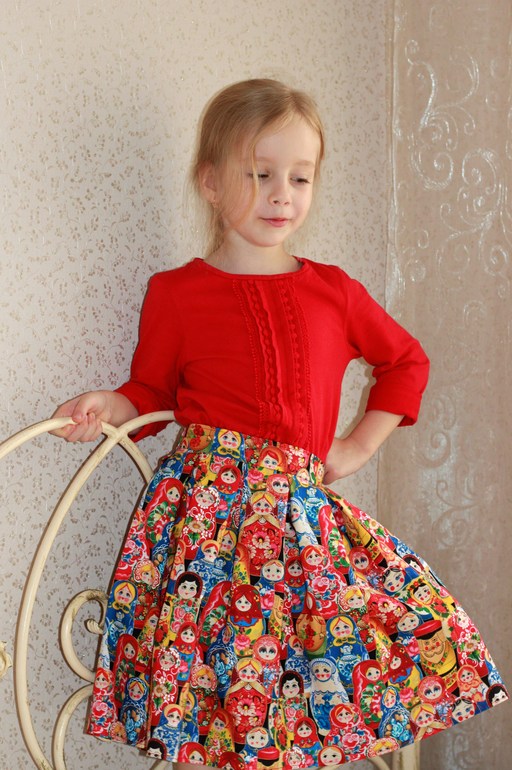 5. "Матрешки" На фото как-то не очень, от нее рябит в глазах, она на самом деле веселенькая такая, "на любителя" так скажем. Видимо я и есть такой любитель необычных и ярких принтов. Ее интересно рассматривать, каждая матрешка еще очерчена золотым контуром. Сначала хотела добавить нижнюю юбку с оборкой из синего фатина, думаю так будет интереснее, но что-то не стала заморачиваться. С бантовыми складками, потайная молния сбоку, сзади в поясе вставлена резинка, чтобы юбка не сползала.