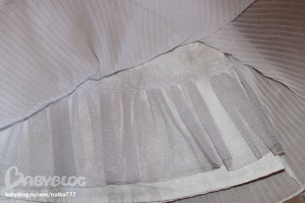 Верхний слой - трикотажная сетка, по краю которой нашита оборка из американского хлопка. Этот хлопок весь состоит из бордюров, у меня на юбку ушло 4 штуки, остальные полосочки другой ширины еще куда-нибудь пристрою. Нижний слой - обычный хлопок нашего производства.