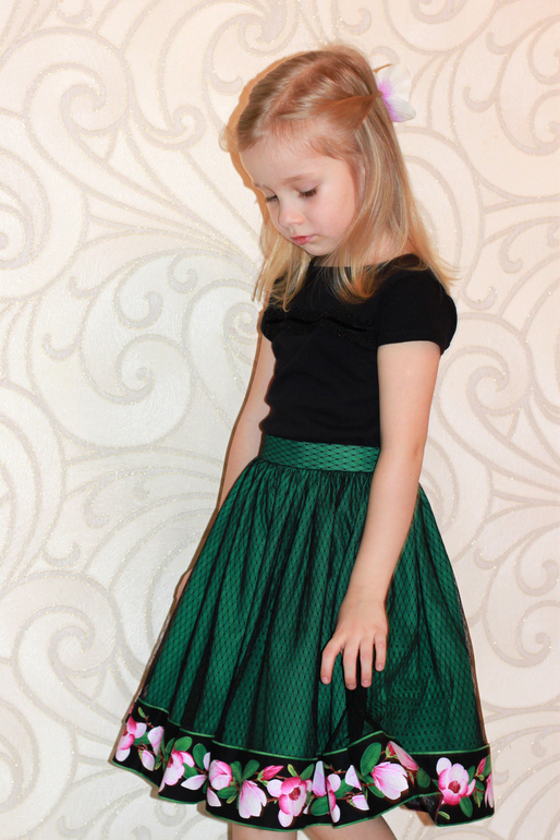 1. Начну с самой проблемной юбки из фатина, тот случай, когда все идет не так. Захотелось мне с дочкой фатиновые юбочки на НГ, и именно зеленого цвета, еще и фотосессия намечалась, думала будут кстати. Легкие пути видимо не для меня и я заказываю фатин широкий (почти 3 метра) с американского сайта, уже потом увидела закупку еврофатина такой же ширины и нужного мне цвета, заказала мятный, но уже для дочки, к слову сказать, вот он самый подходящий для таких юбочек. А этот зеленый оказался такой "стоячий", подобрать ткань на подъюбник тоже оказалось сложно, нашла только трикотаж, но он же совсем не держит форму. Себе кроила юбку-солнце, чтобы не смотреться "бабой на чайнике", сначала 4 слоя фатина, потом оставила только 2, но в результате такой эффект и был