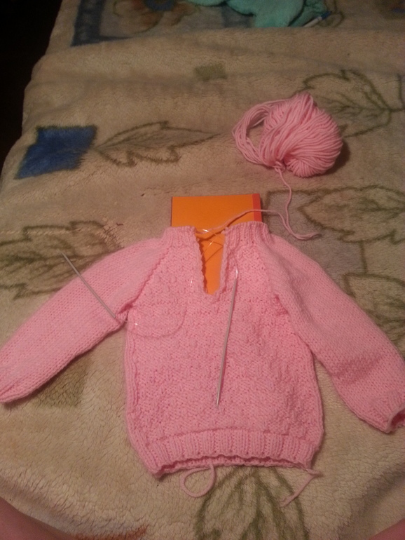 Очень здорово для первой кофточки у вас получилось. А может лучше не пуговичку, а какие нибудь розовенькие тесемочки подобрать и пришить. У нас была распашонка с таким воротом на тесемочках, очень удобно, малыши головой крутят и сложно может оказаться пуговку застегивать.