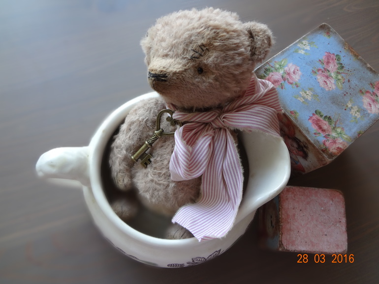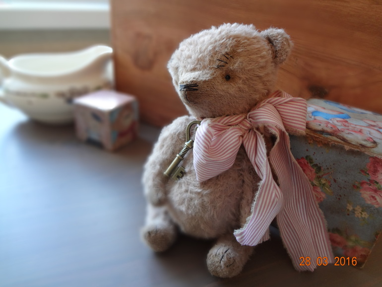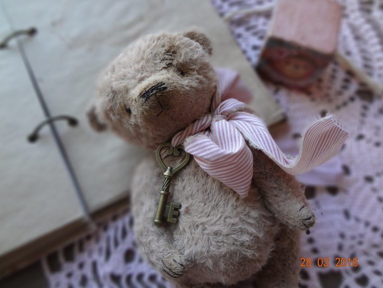 Тедди: мишки и их друзья.Мишка совсем кроха. Ростик 16см. Сшит полностью вручную из немецкой вискозы. Набит плотненько опилочками,утяжелен стальным гранулятом. Состарен,немного штопки. На шее бант с ключиком.