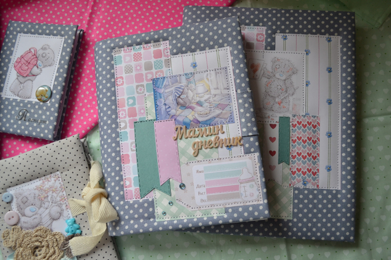 В набор входит--Мамины Заметки-папка на первые документы-книга пожеланий и для мамочки-блокнот -обложка на паспорт)))