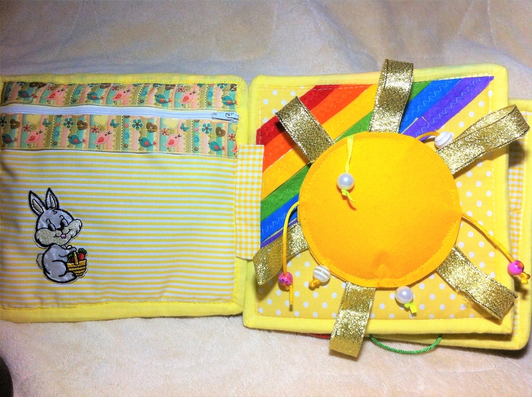 Первый разворот. Кармашек, где прячется тучка. Солнышко и тучка на липучке, лучики у солнышка - перетяжки. Восторг у ребенка)))