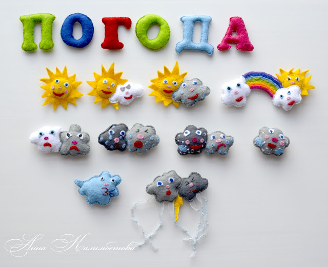 А для наблюдения за погодой мама сделала во такие детальки. Их мы вешаем в верхнем правом углу календаря каждый вечер.