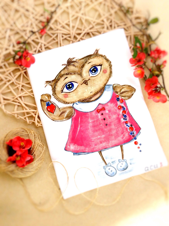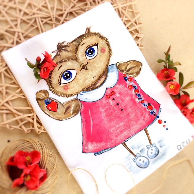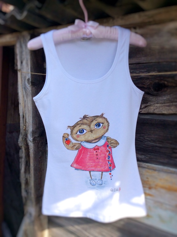 Добрый день, девочки! Сегодня я с очередной работой: маечка (х/б INCANTO, 42-44) расписанная акриловыми красками textile. Рисунок по мотивам картин Инги Пальцер, ее всеми любимые совушки.