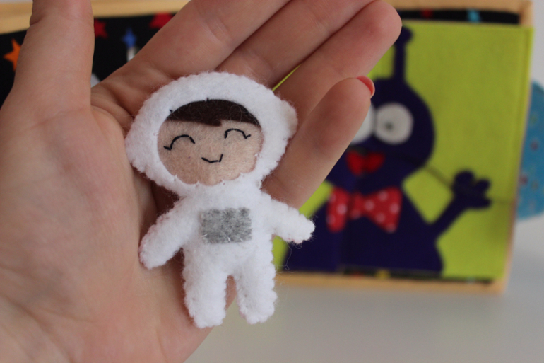 Четвертый разворот с космосом. Тут есть ракета на пуговке, открывается и внутри находим мальчика-космонавта. На этой же страничке есть звездочки-перетяжечки. На второй странице пазл на липучках с инопланетянином.