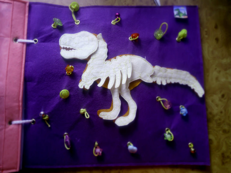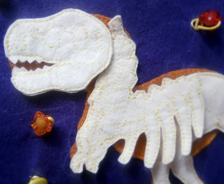 В качестве поля пришит силуэт тираннозавра из велкроткани, "косточки" вышиты на фетре